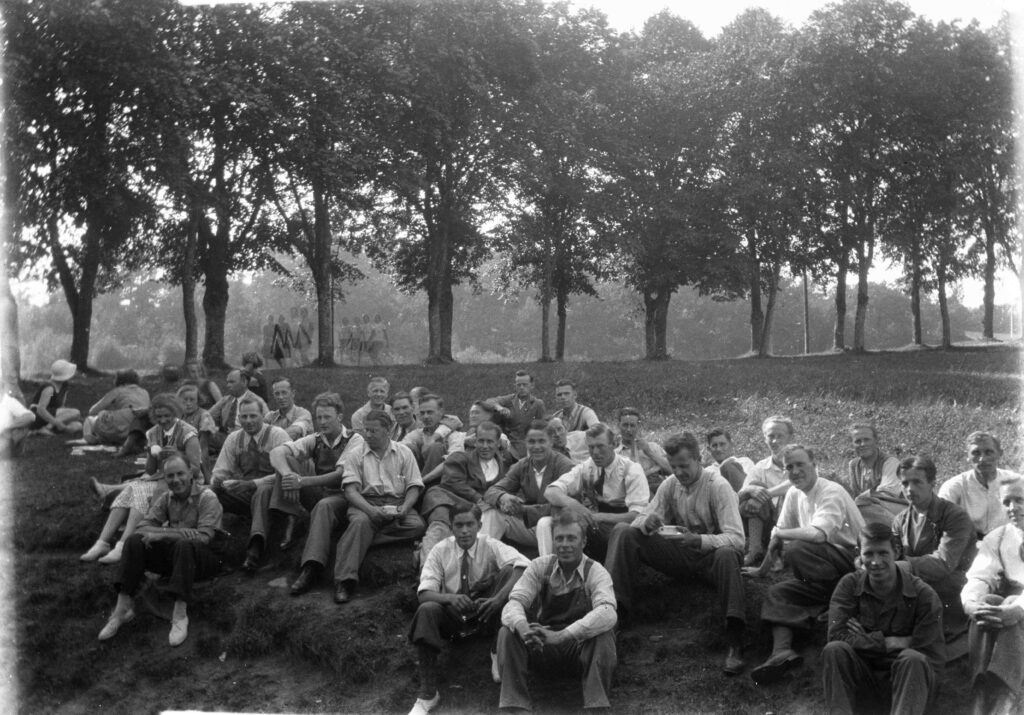 Pausande slöjdare i sluttningen mot Källnääs. I allén ser man fyra idrottsklädda kvinnor på väg från lekfältet till någon lektion i gymnastiksalen på Källnääs. Man har skördat på fältet bakom, så nu kan flickorna från småstugorna snedda över stubbåkern, när de försovit sig och har bråttom till Vänhem. Det är mycket en bild kan berätta! Så minns Kristian Holmqvist, uppväxt på Nääs där hans pappa var lärare 1921-1945. Fotograf: Reinhold Enberg, Vidsel. Mer Nääsminnen av Kristian Holmqvist här.